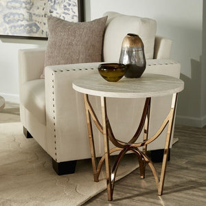 Sure to be the center of attention of any room, the gold paint finish end table displays impressive style and design. Adding eye-catching detail, the beautiful, shiny gold finish metal base is shaped in an intertwining fashion, while upscale vibes are provided with a white mdf table top that serves as the perfect place to display your most prized accessories and decor items.