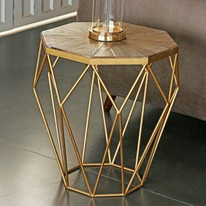 CORNER COLLECTION "Like a diamond in the rough" is the perfect way to describe this octagonal end table, which combines a faceted golden base with a unique parquet top of the recycled wood. This octagonal sunburst End Table blends with, and accents your living room collection. Gold geometric profile holds rays of reclaimed wood to create this side table an elegant choice for your open concept living space.